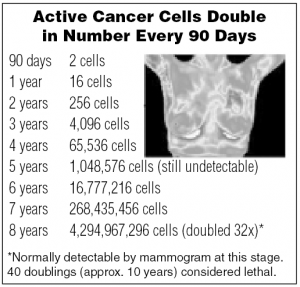 A critical difference between thermography and mammography is the ability to detect problems early enough to use preventive measures, rather than detecting disease at a stage where treatment is imminently required. Mammography uses radiation to image only the soft fleshy tissue of the breasts. Thermography images a much larger area including the entire breast region, between breasts and axillary views (Ref: Clinical Thermography, Dr. George E. Chapman). Thermography can see inflammatory breast cancer (IBC), a type of cancer that does not develop as lumps or masses in your breast. IBC cells block lymph vessels in the skin of your breast. This type of cancer grows rapidly and often spreads to other organs in your body (Ref: Inflammatory Breast Cancer: Questions and Answers, www.cancer.gov/cancertopics/factsheet/sites-types/ibc).